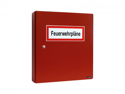 zur Verwendung als Einzelgehäuse oder zum Anbau an eine Feuerwehr-Informationszentrale FIZ-A3 oder FIZ-A4. Gehäuse aus Stahlblech, pulverbeschichtet in feuerrot (RAL 3000), optional in jeder anderen RAL-Farbe lieferbar. Schwenkbare Tür mit Türknauf, zur geschlossenen Aufbewahrung der Feuerwehrpläne DIN 14095.