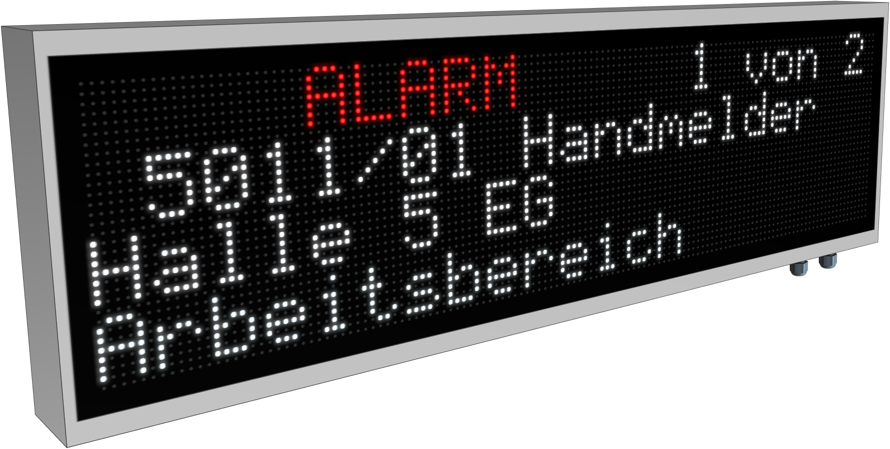 Zur großflächigen Anzeige von Betriebszuständen einer Gefahrenmeldeanlage. Rahmengehäuse aus Aluminium (silber eloxiert), Frontscheibe aus entspiegeltem Acrylglas, zur Montage im Innenbereich. Die Ansteuerung erfolgt über eine serielle RS485-Schnittstelle am APLIS-Datenserver. Es können mehrere Großdisplays parallel betrieben werden. Meldergruppe, Meldernummer und Zusatztext werden direkt aus dem APLIMO-/VAREXplus-System übernommen. Hierdurch ist keine Programmierung erforderlich (plug&play). Die Darstellung der Texte erfolgt auf 4 Zeilen zu jeweils 21 Zeichen. Stehen mehrere Meldungen an, so werden diese nacheinander automatisch durchgescrollt. Kabeleinführungen von unten (PG9 Verschraubung). Lieferung inkl. Wandmontagesatz.
