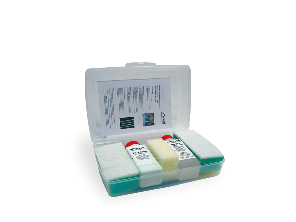 zum Einsatz bei stärksten Verunreinigungen, geschädigten oder korrodierten Edelstahl-Oberflächen. Set bestehend aus 250 g Spezialreiniger, 250 ml Korrosionsschutz, 2x Spezialschwamm, 1x Polierpad sowie Schutzhandschuhe.