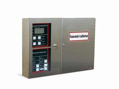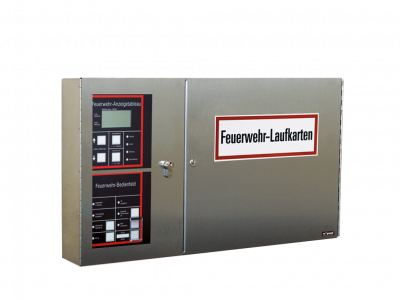 Abgesetzte Feuerwehr-Anlaufstelle zur Montage auf Putz im Innenbereich mit integriertem Laufkartendepot. Gehäuse aus V2A-Edelstahl, geschliffen. 2-Flügel-Türsystem verschließbar durch ein Kastenschloss zur Aufnahme eines Feuerwehr-Profilhalbzylinders. Laufkartendepot zusätzlich verschließbar durch ein CL1-Schloss mit Zwangsöffnung durch das Kastenschloss. Inkl. Halterung für Dünnglasscheiben und "Außer Betrieb"-Schilder. Kabeleinführungen von oben, unten und Rückwand.