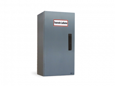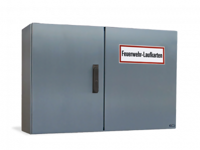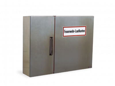 Abgesetzte Feuerwehr-Anlaufstelle zur Montage auf Putz im Außenbereich mit integriertem Laufkartendepot. Gehäuse aus V2A-Edelstahl (geschliffen), ausgestattet mit einer Belüftungsmembrane zur Minimierung von Kondenswasser. 2-Flügel-Türsystem verschließbar durch Schwenkhebelverschluss zur Aufnahme eines Feuerwehr-Profilhalbzylinders (optional zusätzliche Doppel-PZ Schließung in rechter Tür möglich). Sichtscheibe für FAT und FBF in der linken Tür. Inkl. Halterung für Dünnglasscheiben und "Außer Betrieb"-Schilder. Kabeleinführung von unten.