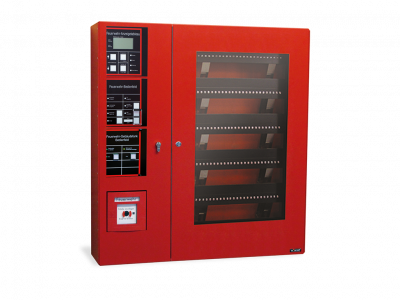 Feuerwehr-Anzeigetableau (FAT) nach DIN 14662, Feuerwehr-Bedienfeld (FBF) nach DIN 14661 und Druckknopfmelder nach DIN EN 54-11.