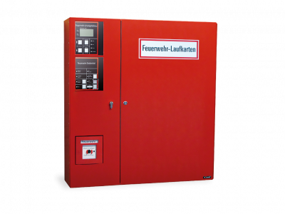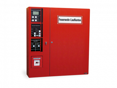 Abgesetzte Feuerwehr-Anlaufstelle zur Montage auf Putz im Innenbereich mit integriertem Laufkartendepot. Gehäuse aus Stahlblech, pulverbeschichtet feuerrot (RAL 3000), optional in jeder anderen RAL-Farbe lieferbar 2-Flügel-Türsystem verschließbar durch ein Kastenschloss zur Aufnahme eines Feuerwehr-Profilhalbzylinders. Laufkartendepot zusätzlich verschließbar durch ein CL1-Schloss mit Zwangsöffnung durch das Kastenschloss. Inkl. Halterung für Dünnglasscheiben und "Außer Betrieb"-Schilder. Kabeleinführungen von oben, unten, rechts und Rückwand.