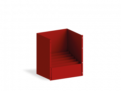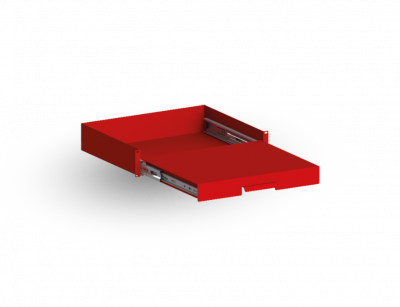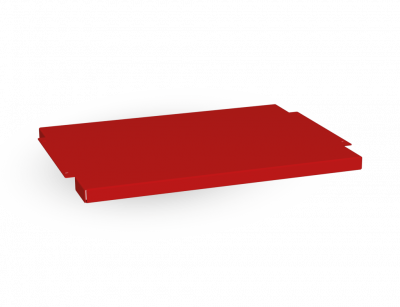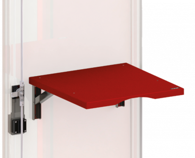 Tischplatte aus Stahlblech mit stabilen Scharnieren, pulverbeschichtet feuerrot (RAL 3000). Montiert an der Tür-Innenseite zur sicheren Ablage von diversen Einsatzunterlagen.