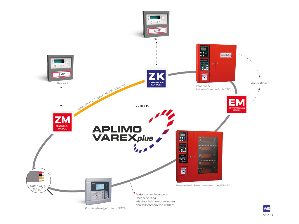 Sollen mehrere Brandmelderzentralen nach DIN 14675 / VdS 2878 zusammengeschaltet werden, ist das VAREXplus-System erforderlich. Wie beim APLIMO-System werden die Brandmelderzentralen durch die jeweilige serielle Schnittstelle bzw. FBF-Schnittstelle mit je einen Zentralenkoppler (ZK) an das VAREXplus-System angeschlossen. An einem oder mehreren FAT können entweder die Meldungen aller BMZ angezeigt oder alle BMZ mit einem oder mehreren FBF bedient werden. Des Weiteren ist auch die Realisierung aller Applikationen möglich.