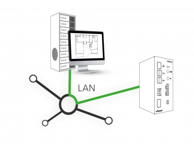 Mini-PC zur Aufnahme einer Netzwerkverbindung (LAN). Die Integration des LAN-Gateways gemeinsam mit dem APLIS-Datenserver in ein Netzwerk, ermöglicht die abgesetzte Ansteuerung eines Monitors (bis 4K-Auflösung) zur Anzeige oder Bedienung von APLIS-Funktionen, z.B. digitale Brandmeldetableaus, virtuelle Feuerwehr-Anlaufstellen. Der Monitor wird vom LAN-Gateway via HDMI-Kabel angesteuert.
