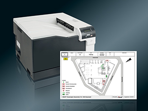 DIN A4 duplex Farblaserdrucker für den automatischen oder manuellen Ausdruck von Feuerwehr-Laufkarten. Anschluss des Druckers als LAN-Drucker im Netzwerk (empfohlen) (Ethernet 10/100Base-TX) oder über USB2.0 (keine Störungsrückmeldungen möglich) direkt am APLIS-Datenserver. Geeignet für den Einbau in ein FAS-2T.