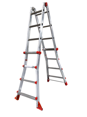 Durch ent- und verriegelbare Sicherheitsgelenke schneller Umbau von Steh- zu Anlegeleiter möglich. Mühelose Verstellung von Sprosse zu Sprosse durch seitliche Blockiergriffe. Standsicher durch profilierte Sprossen und seitlich montierbaren Füßen zur Standverbreiterung. Auf kleinstem Raum zu transportieren und aufzubewahren.