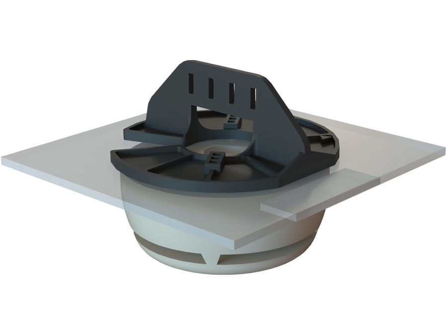 aus halogenfreiem und schwer entflammbarem Kunststoff (ABS V0) in der Farbe schwarz. Zur Verwendung als Gegenplatte für die schnelle und sichere Montage von Brandmeldern, Signalgebern, Sockel, etc. an Zwischendecken (z. B. Odenwalddecken). Mit zentraler Kabeldurchführung und vier Befestigungsschlitzen für Kabelbinder zur Zugentlastung. Durch die seitliche Öffnung können auch bisher unsachgemäß installierte Geräte (z. B. auf Holzresten montiert) nachträglich korrekt montiert werden, ohne Kabel abzuklemmen.